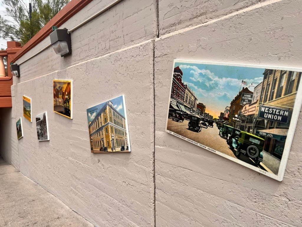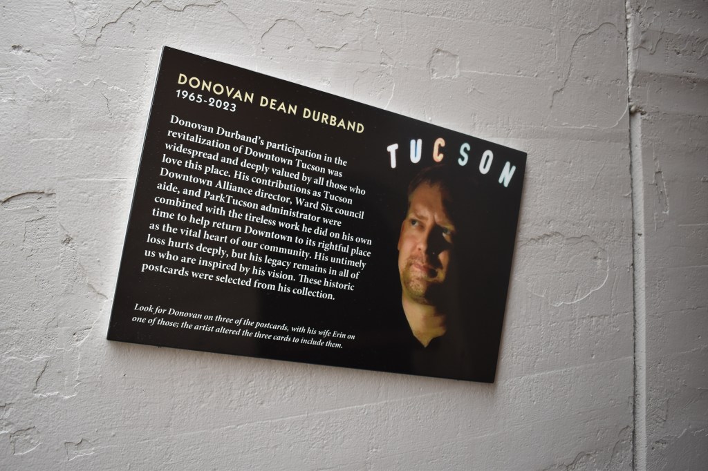 Prior to that date, the underpass was cleaned and painted, new lighting was installed and panels displaying 2 x 3 foot postcards of Tucson’s history and culture were installed. The postcards selected were from Donovan’s personal collection, and in four of them, the artist Stephen Farley photoshopped Donovan into them with permission granted by the Historical Commission. Donovan’s wife Erin is also photoshopped along with him in one of the panels.